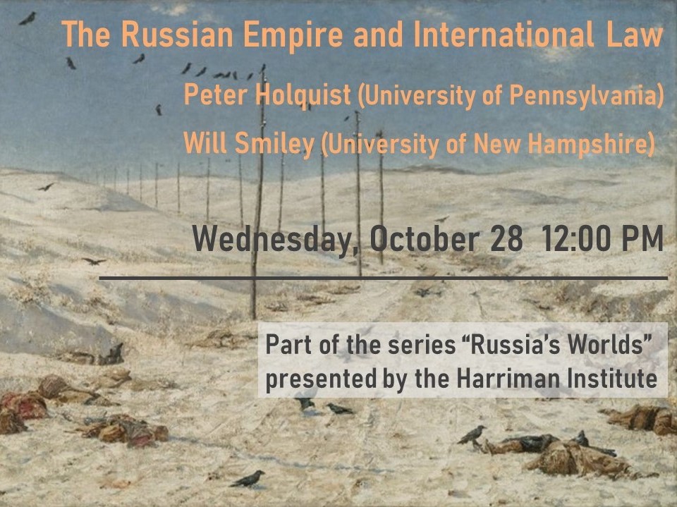 Please join us for a the inaugural event of the “Russia’s Worlds” lecture series. Peter Holquist (Ronald S. Lauder Endowed Term Associate Professor of History, University of Pennsylvania) will discuss his forthcoming book project “‘By Right of War’: The Discipline and Practice of International Law of War in Imperial Russia, 1868-1917” alongside Will Smiley (Assistant Professor of the Humanities, University of New Hampshire), who will present his work on “Slaves, Prisoners, and International Law between the Ottoman and Russian Empires, 1739-1878.” The two presentations will be followed by a roundtable discussion and a brief Q&A.