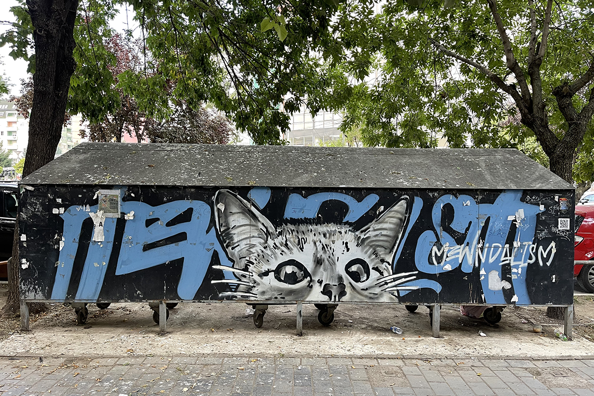 Mitrovica, in northern Kosovo, is a city divided ethnically into Serbian and Albanian neighborhoods; UN peacekeeping forces patrol the pedestrian bridge that connects the two. Graffiti abounds, most of it with references to the ethnic divide and the war that led to the city’s division. But in southern Mitrovica, the city’s Albanian stronghold, Boyang Liu (MARS-REERS ’25) found a rare example of nonpolitical street art: an arresting mural of a cat’s startled face, peering at passersby.