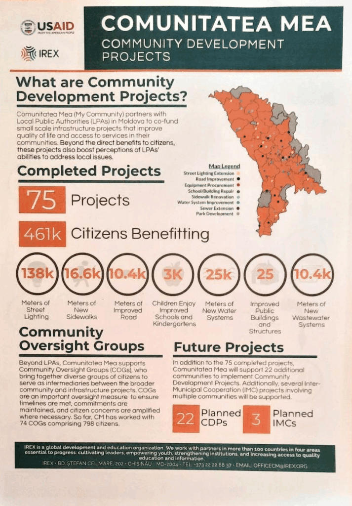 One-pager of the USAID funded project Comunitatea Mea (My Community) implemented by IREX in Moldova.