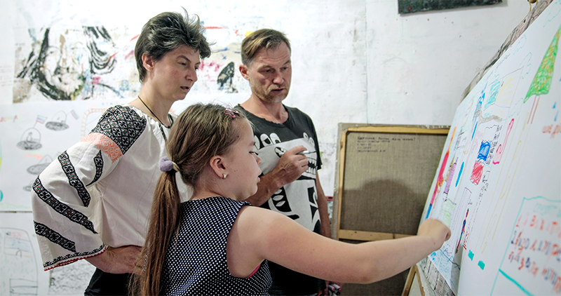 Among the most disturbing images from the art sessions is a six-headed green dragon bearing the letter Z to signal its support of Russia’s 2022 invasion of Ukraine. The dragon appears in a long artistic narrative created collaboratively by a local artist, Iryna Potapenko, Khodakivska, and Artem, a 14-year-old boy from Kherson. After occupying Artem’s town, the new Russian authorities ordered children to attend schools under Russian control. Some, like Artem, stayed home, studying online with Ukrainian schools when they could get an Internet connection. Eventually soldiers came to Artem’s home; the metaphorical dragon represents his memory of their visit. Each of its six long necks are topped by a soldier’s helmeted head spitting fire at the tiny figure of a child below. All around them are Russian phrases, written by Artem, of the dragon heads shouting: