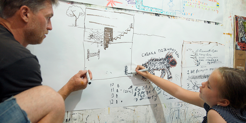 “My first idea is that we will talk with children, and [Kakhidze] will draw images” of what they describe, to be used in an animated film, said Khodakivska. Kakhidze agreed to meet when Khodakivska got to Kyiv. But no specific plan was finalized; Khodakivska just knew that art needed to be a part of telling the story of deportation.